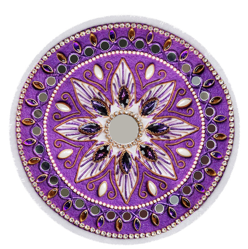 A bit of sparkly fun, these mandala incorporate many of the materials used in traditional Indian embroidery used particularly on choli (bodices): glass jewels, small mirrors, vibrant metal threads and bright coloured fabrics.